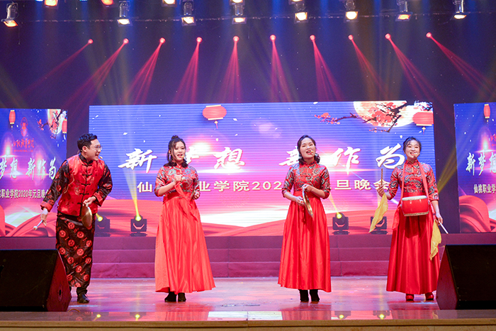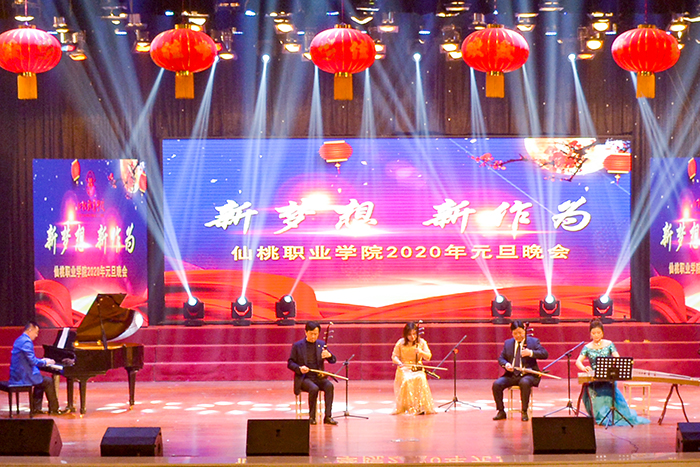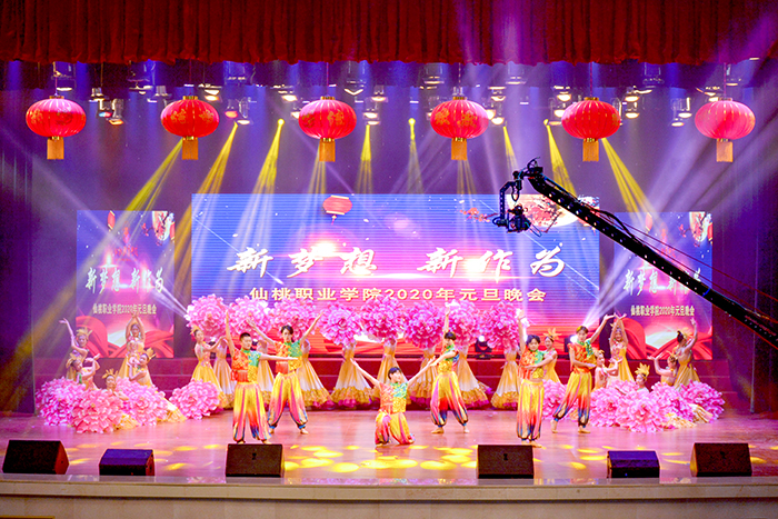 12月27日晚,文化艺术中心流光溢彩、笑语欢歌,“新梦想 新作为”元旦晚会在此盛大上演。市财政局局长黄文兵、市卫建委主任杜伟华、市广播电视台台长陈行军、市妇联主席熊云、市扶贫办主任陈学军、武汉新港汉江集装箱股份有限公司总经理梁华忠、学院党委书记郭百高、院长李立勇与1000余名师生一同观看演出、共迎佳节。