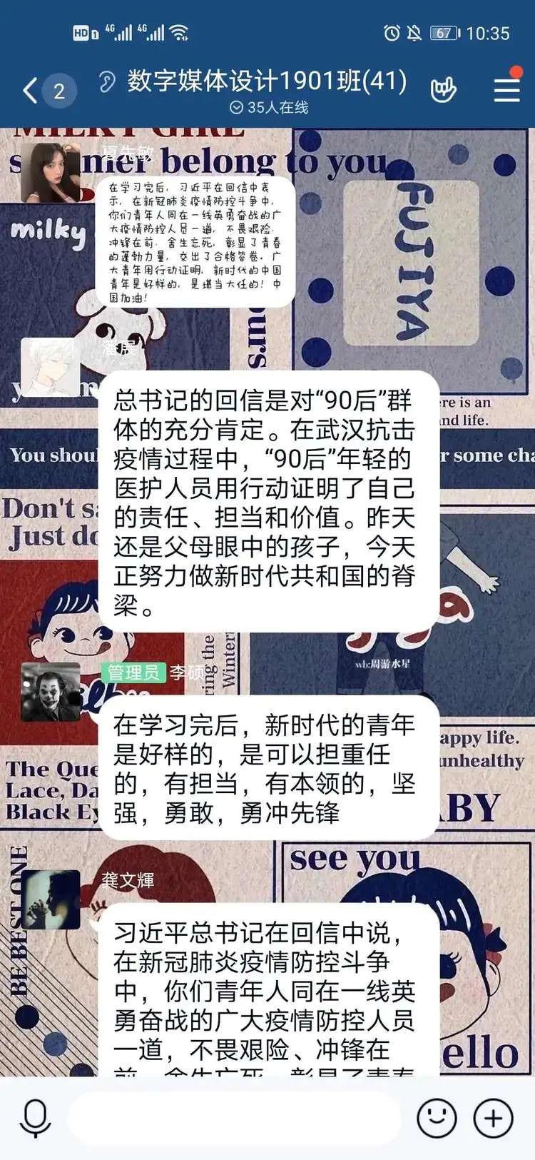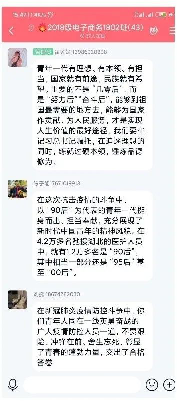 各团支部、团小组充分利用“学习强国”视频会议、微信视频、腾讯视频会议、“学习通”在线课堂等方式集中学习总书记回信重要精神,围绕“对国家抗击疫情采取措施的认识,当代青年的价值观和责任担当”进行交流研讨,分享感悟和体会。