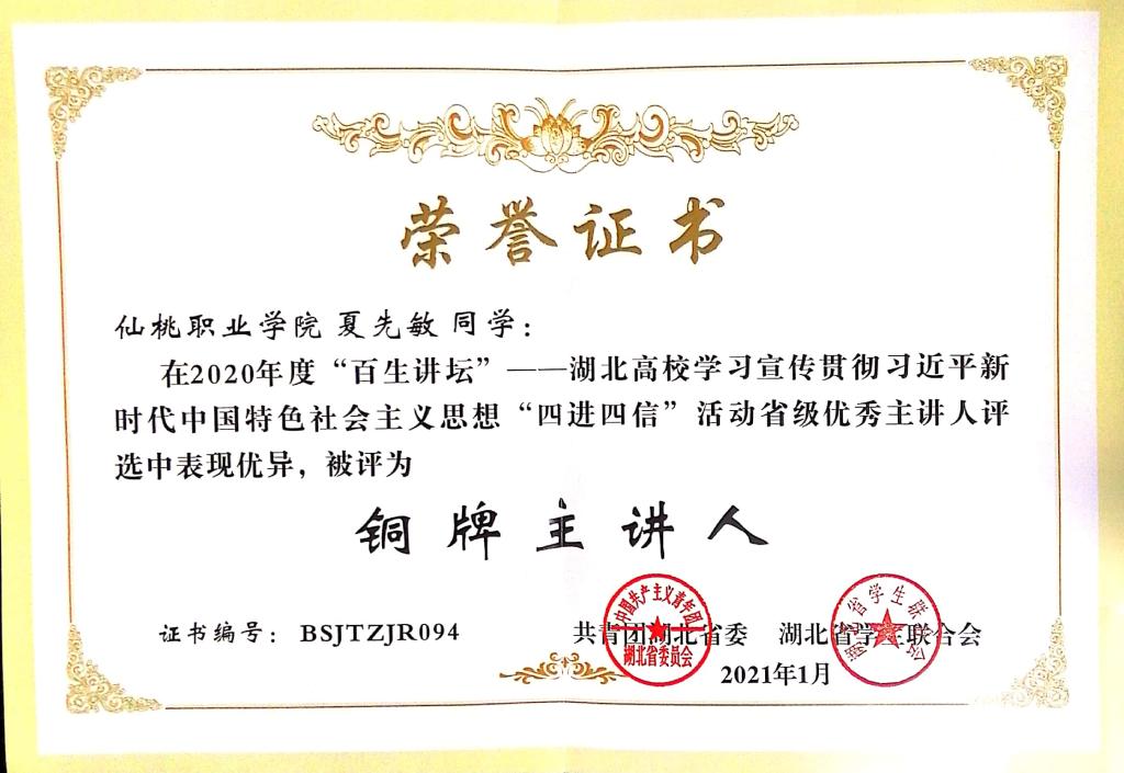 近日,团省委公布了2020年度湖北省“百生讲坛”优秀主讲人评选结果。我院数字媒体艺术设计1901班学生夏先敏荣获“铜牌主讲人”称号。本次比赛经材料审核、赛区预赛、省级复赛暨示范巡讲,共评出优秀主讲人100名。