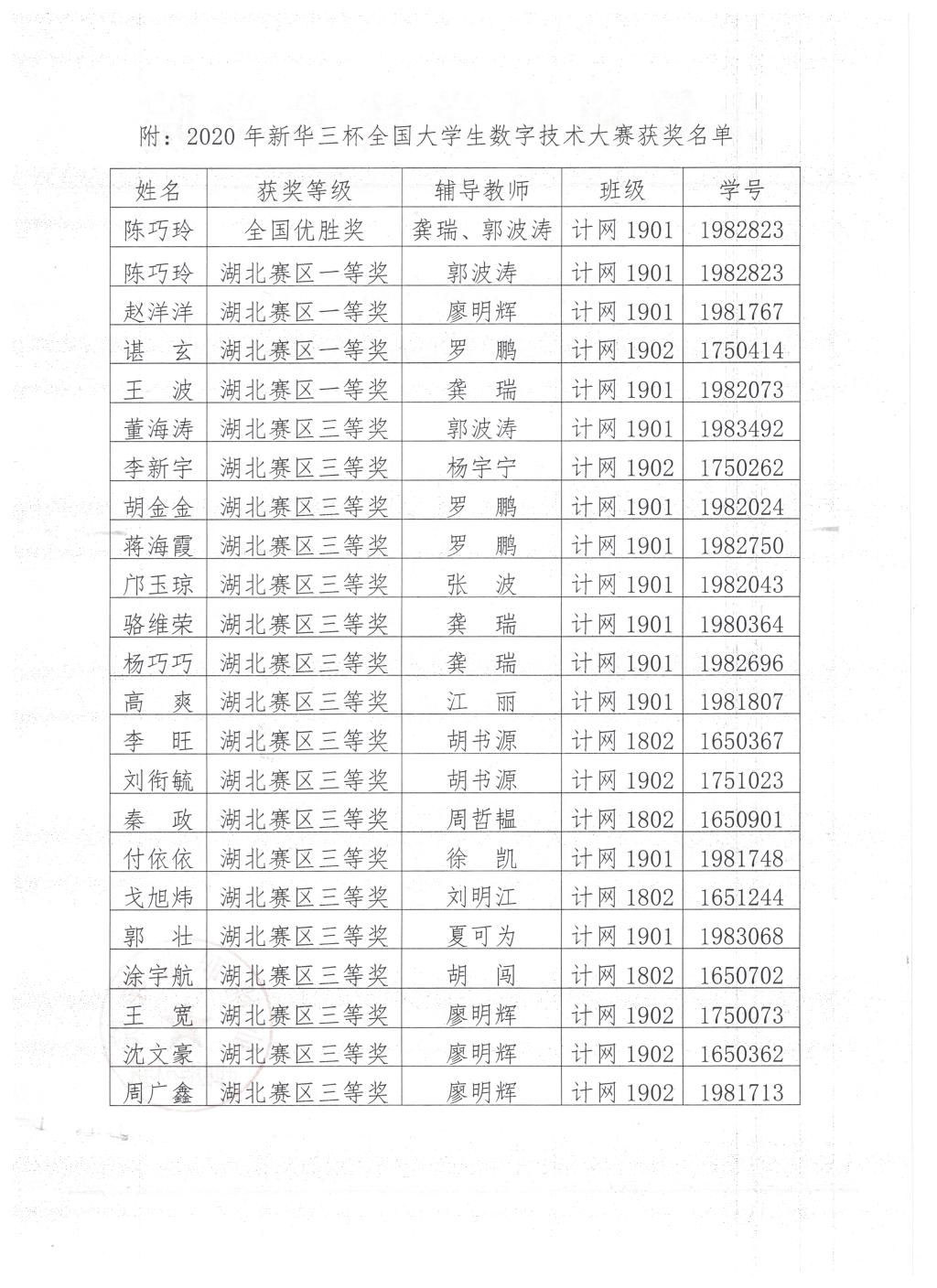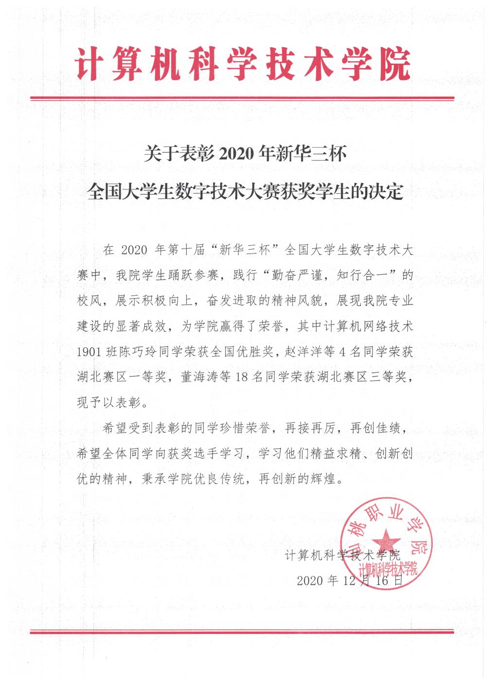 关于表彰2020年新华三杯全国大学生数字技术大赛获奖学生的决定