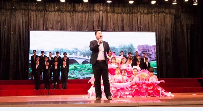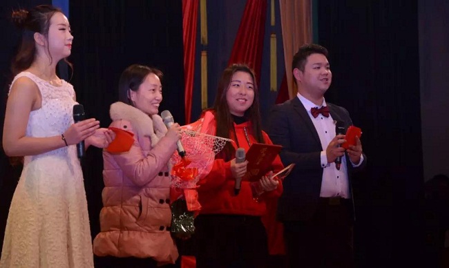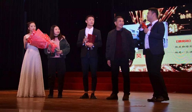 “最美教师”罗鹏(左二)、“最美大学生”李霁(中)的公司领导杨驰总经理(右二)发表感言