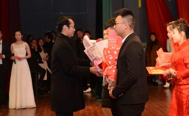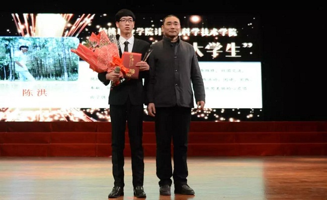 学院党委委员、副院长谢从堂(右)为“最美大学生”陈洪颁奖