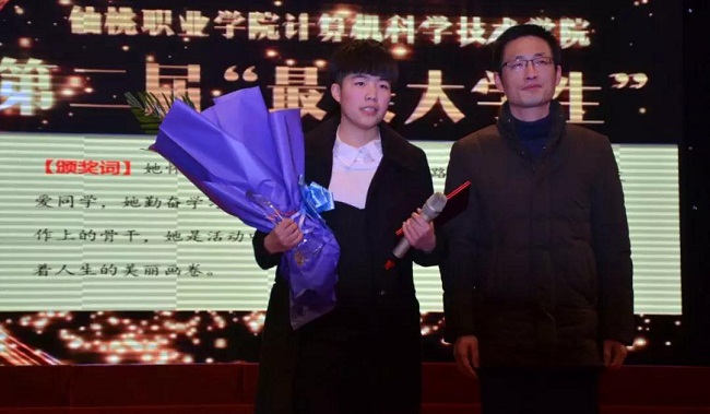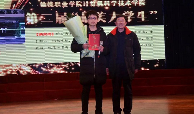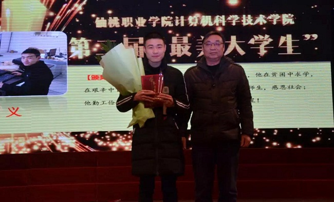 学院党委副书记、纪委书记涂旭东(右)为“最美大学生”胡义颁奖