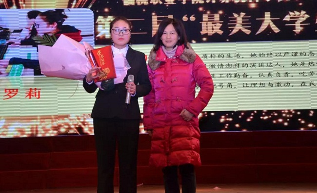 学院党委委员、党委组织部部长刘泳梅(右)为“最美大学生”罗莉颁奖