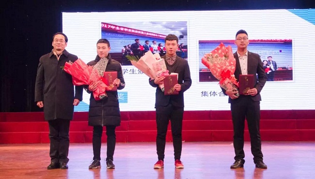 学院党委副书记、院长李立勇(左一)为国赛省赛获奖“学习标兵”(右起)王国翔、李科君、胡义颁奖