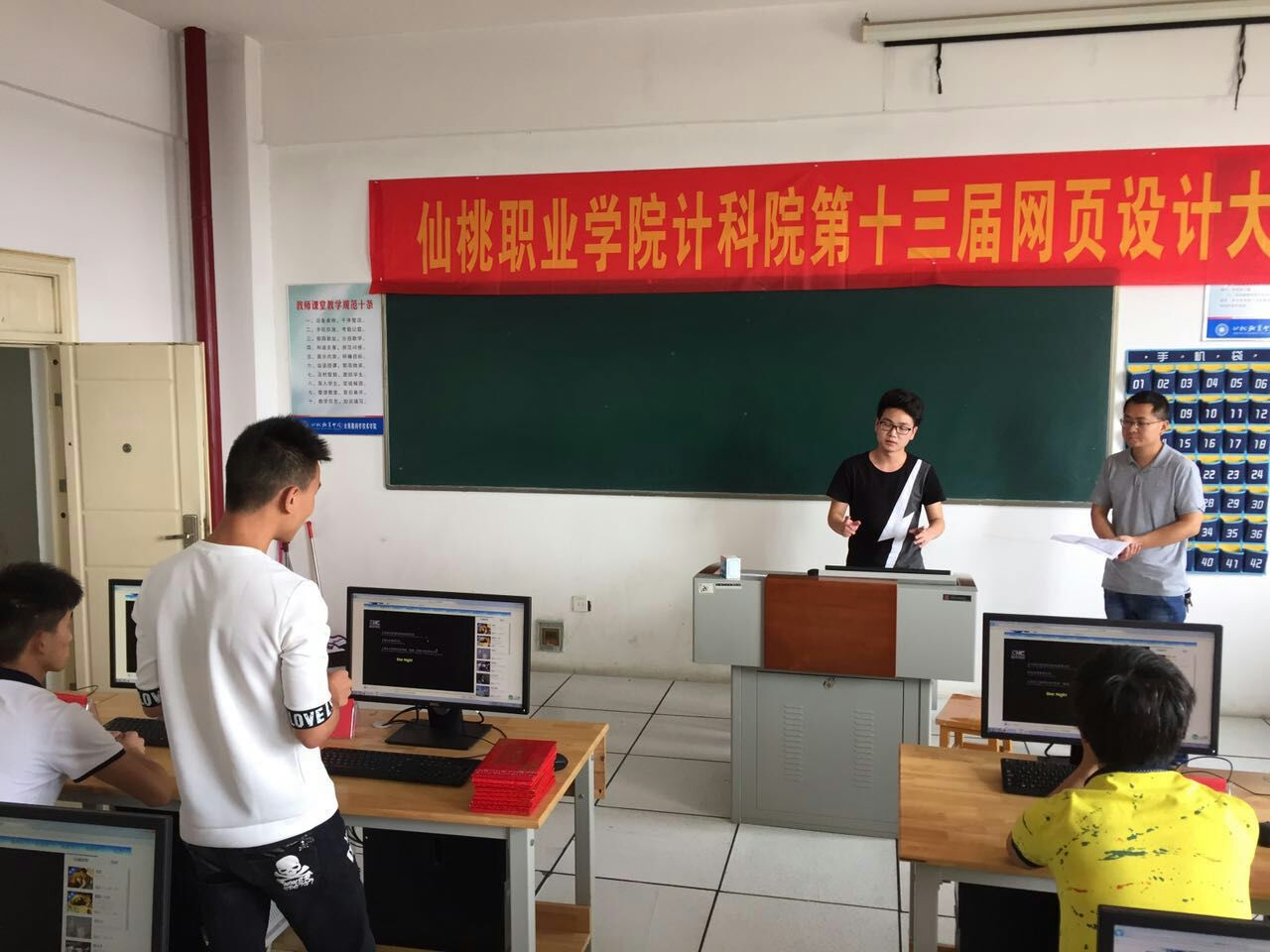 6月16日下午2:30,我院第十三届网页设计大赛在信息大楼504举行,10名进入决赛的选手首先一一上台演示自己设计的网页作品,解说网页设计思路、使用的技术及网页内容、实现功能,然后接受其它选手的质询,最后由评委点评。该项比赛是我院传统比赛项目,由计算机网络技术专业针对培养岗位网页设计师举办,每年都有众多的优秀学生从比赛中脱颖而出。