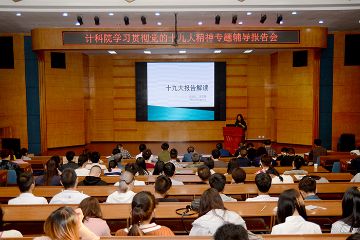 10月27日下午,计算机科学技术学院举行专题辅导报告会,邀请思政课部教师汪艾玲为党员师生、入党积极分子宣讲党的十九大精神。