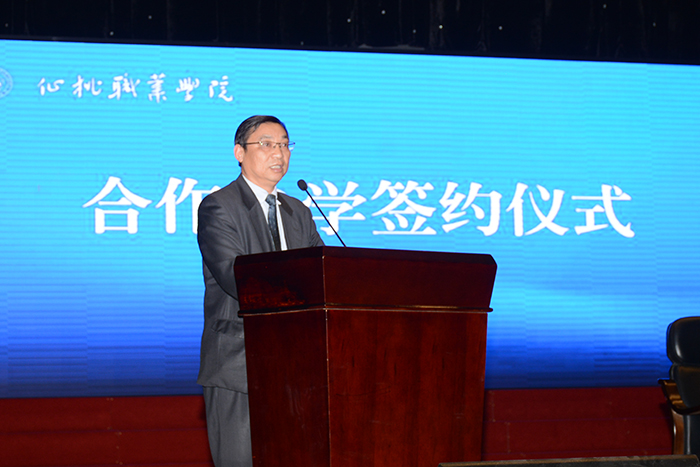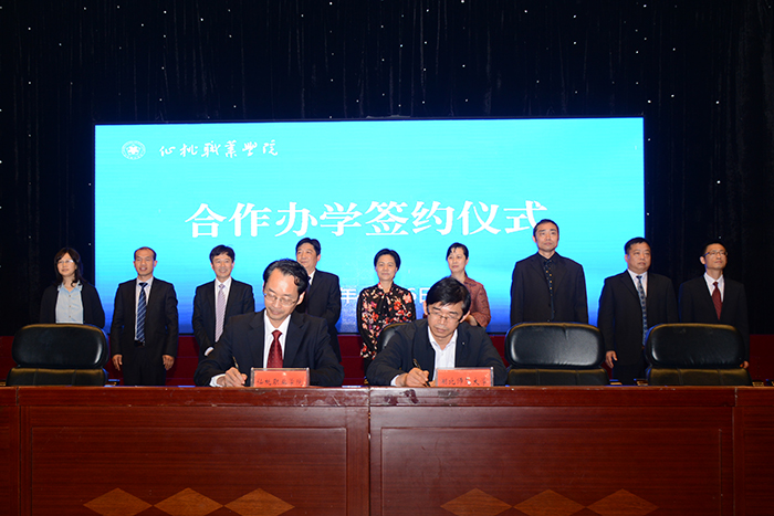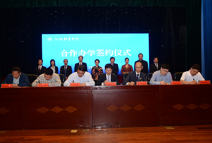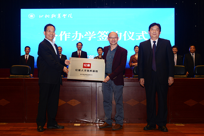 合作办学签约仪式上,我院与湖北师范大学、天门职业学院、武汉亿童文教股份有限公司、浙江祥生酒店、仙桃市卫计委、仙桃市体育局等16家高校、企事业单位及校友企业签订合作办学协议。党委书记郭百高与1986届校友、武汉亿童文教股份有限董事长陈先新共同为“亿童人才培养基地”授牌,该公司将与我院在学前教育专业建设、人才培养等方面开展深度合作。
