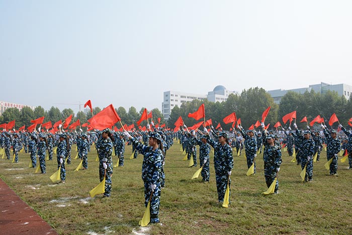 上午9点,鲜艳的院旗高高飘扬,嘹亮的军乐响彻校园,2015级新生军训会操开始,党委书记郭百高检阅学生军训方队,严整的队伍、高昂的口号充分展示了青年学生奋发向上的精神风貌。在海军工程大学教官的指挥下,分列式开始,各方队迈着整齐的步伐通过主席台接受检阅。随后,军体拳方队为师生们表演了精彩的拳术和擒拿格斗,旗语方队中红黄两色小旗在学生手中翩翩起舞,让大家感受到了青年学生的飒爽英姿。虽然只有短短15天的练习,但是学生们昂扬的斗志和青春的活力给大家留下了深刻印象,赢得了领导和师生们的阵阵掌声。