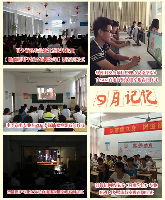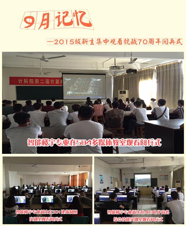 9月3日上午9点,计科院2015级楼宇智能化工程技术专业、软件开发与项目管理(安卓学院)、计算机网络技术(百度学院)、电子商务专业新生集中在106安防自动化实训室、202多媒体教室、204多媒体教室、209实训室、301实训室、404实训室、502实训室、504多媒体教室等教室集中观看抗战70周年阅兵式,接受国防教育。