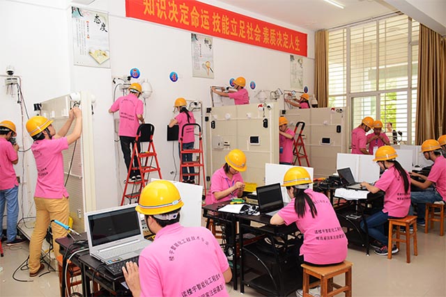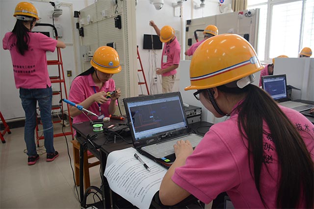 6月11日,计算机科学技术学院楼宇智能化工程专业实训中心里,6组18名学生头戴安全帽,身穿整齐工装,或者认真在电脑上绘图,或者焊接各类导线,或者铺设连接线路,各司其职,安静迅速、有条不紊地进行楼宇安防系统的安装与调试,展示专业学习成果。