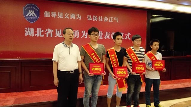 7月23日,省综治办、省见义勇为基金会万学斌一行来到仙桃,对涌现出的见义勇为先进进行表彰,授予我院计算机科学技术学院学生邓南昕、李青、王意、吴全勇4位同学为“湖北省见义勇为先进群体”,省综治办、维稳办副主任万学斌为四位同学颁发了荣誉证书和奖金。