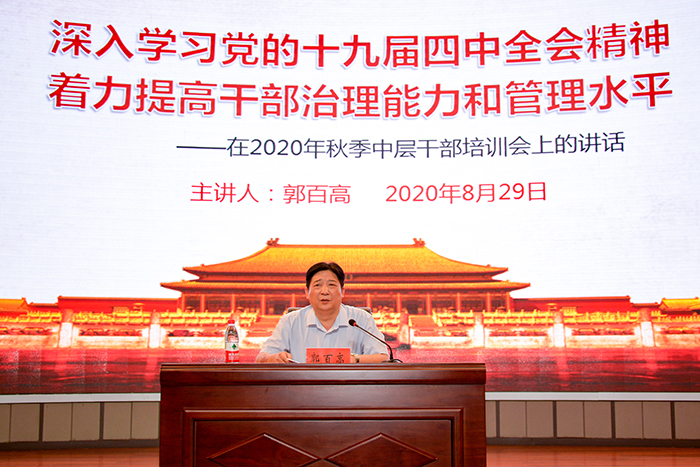 8月29日至30日,我院举行2020年秋季学期干部培训会,深入学习党的十九届四中全会精神,提升干部治理能力和管理水平。党委书记郭百高、院长李立勇作专题辅导报告。党委副书记梁晓华作培训总结。