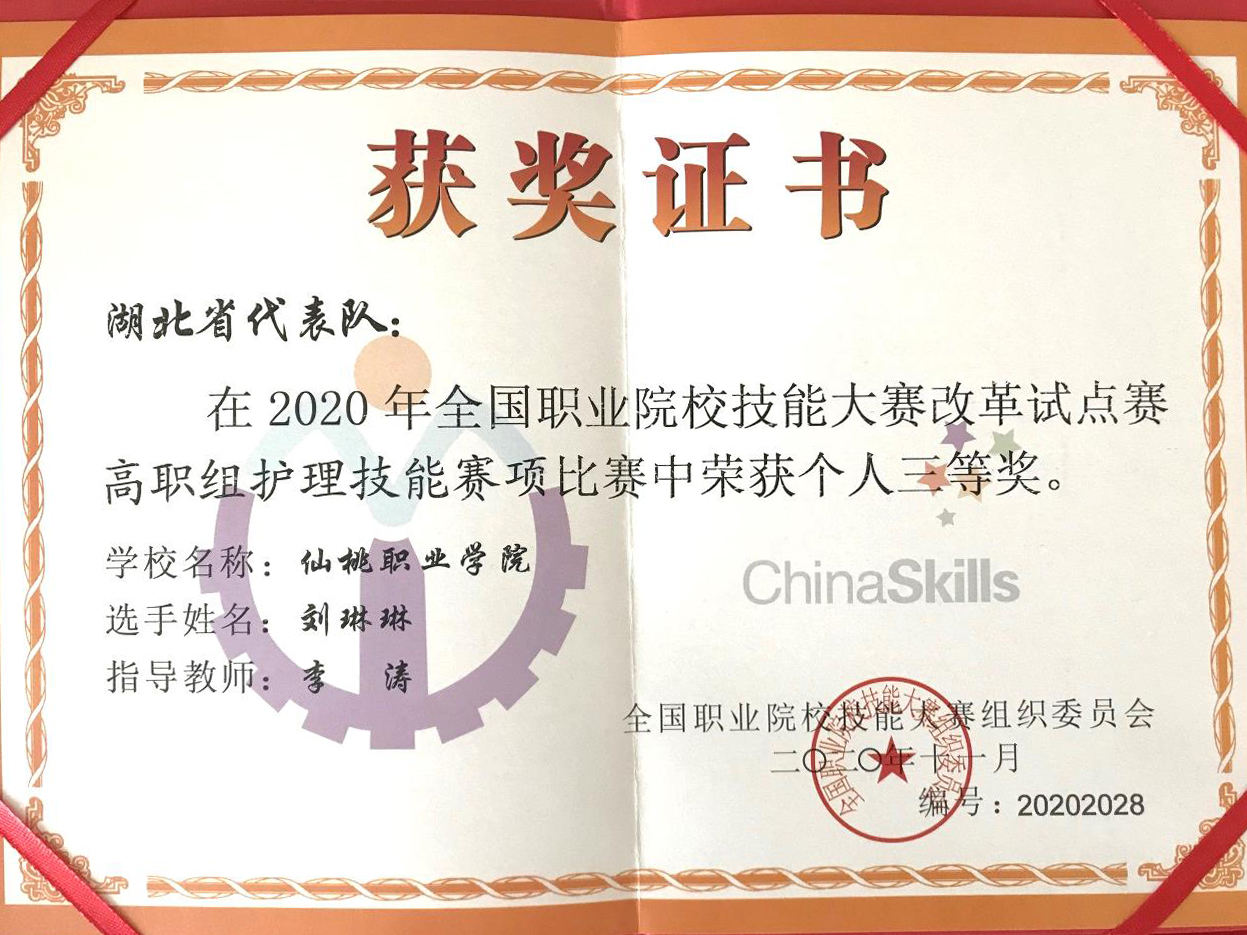 在2020年全国职业院校技能大赛改革试点赛高职组护理技能赛项中,医学院学生刘琳琳作为湖北省唯一参赛选手,与来自全国31支代表队的选手同台竞技,获得个人三等奖。这是自2017年以来我院连续四年斩获该赛项奖项。