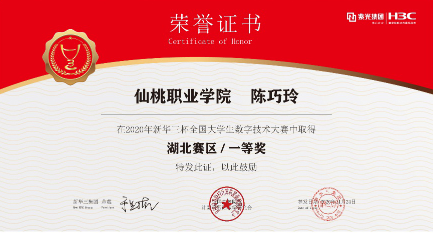 在2020年“新华三杯”全国大学生数字技术大赛湖北赛区比赛中,计算机科学技术学院学生陈巧玲、赵洋洋、王波、谌玄获一等奖,其中陈巧玲晋级全国总决赛。