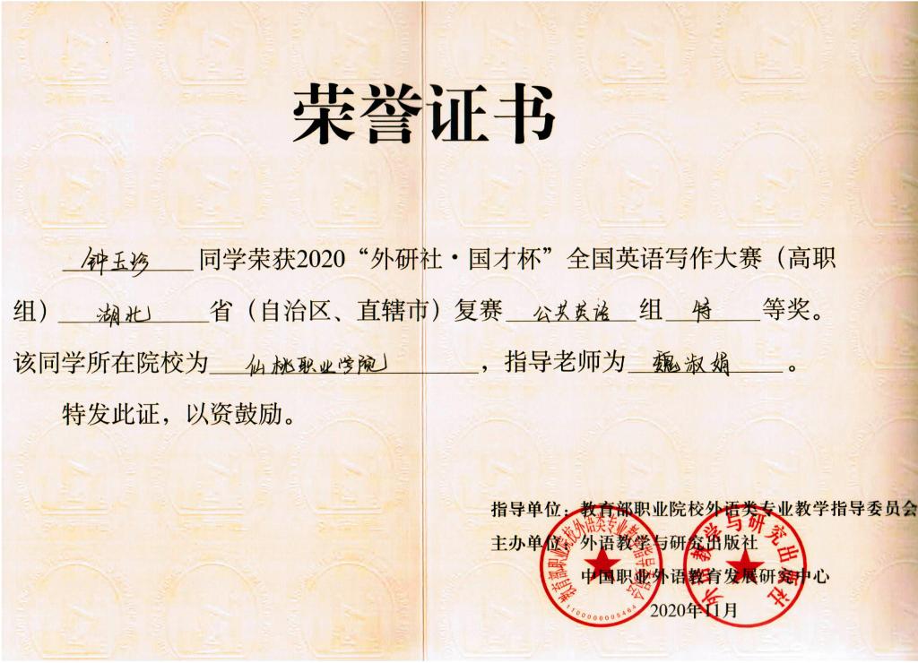 2020年Uchallenge大学生英语挑战赛由演讲、写作、阅读三大赛事组成。在全国英语写作大赛(高职组)湖北赛区比赛中,医学院学生钟玉珍、教育学院学生林艺分获公共英语组特等奖、二等奖,其中钟玉珍晋级全国总决赛,这也是我院学生连续第三年获此资格;在全国英语演讲大赛(高职组)湖北赛区比赛中,教育学院学生韩慧灵、李杨双双获得非英语专业组二等奖。