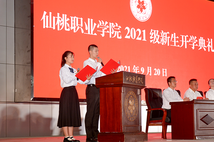 新生代表,医学院医学影像技术专业学生吴阳、护理专业学生曹会玲诵读《仙桃职业学院学生日常行为规范(试行)》