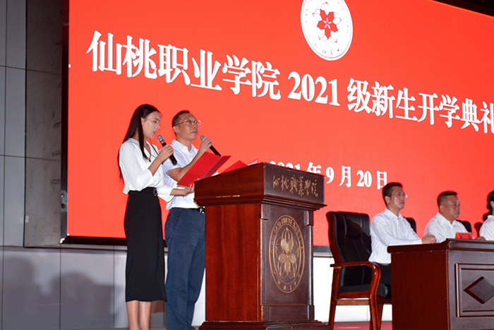 开学典礼上,新生代表,医学院医学影像技术专业学生吴阳、护理专业学生曹会玲诵读《仙桃职业学院学生日常行为规范(试行)》,教师代表,计算机科学技术学院教师廖明辉、经济与管理学院教师杨淑华诵读《新时代高校教师职业行为十项准则》,教育学院学生集体诵读《师说》,机械电子工程学院、非织造布产业学院学生齐唱《团结就是力量》。